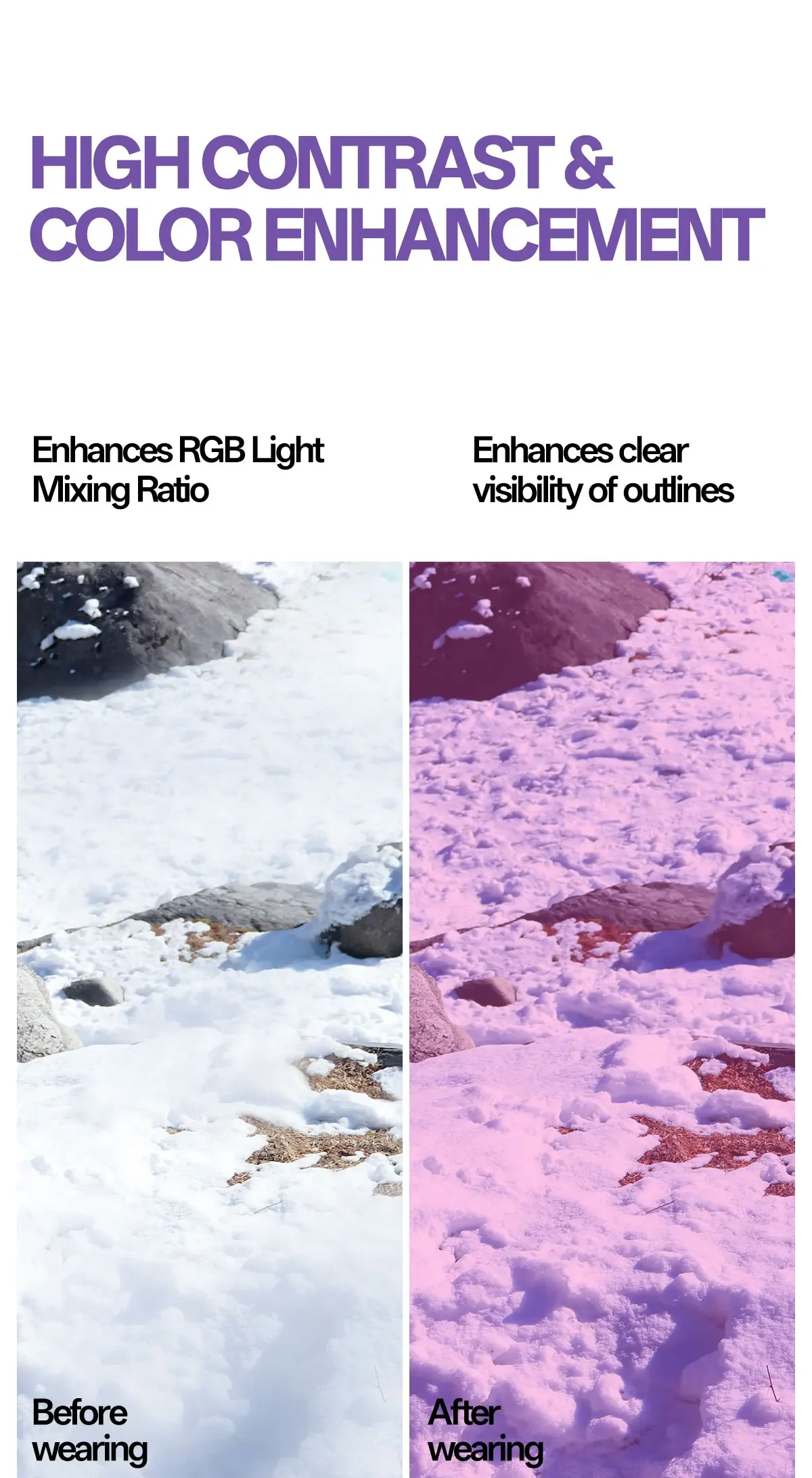 ⛷️Photochromic lenses: When exposed to UV sunlight outdoors, the lenses will change color according to the intensity of the UV rays. The stronger the UV rays, the darker the lens color will become.